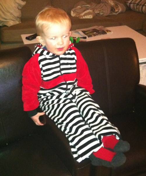 Med to gutter som vokser som ugress, må garderoben stadig utvides. Her har Makro fått seg onepiece, etter Mikro tok over hans gamle. Dressen (som han har døpt "kjolen") er sydd i stripete velour og rød stretchfrotté, str 98. Var litt redd den ble B-gjengen-aktig, men tror vi berga.